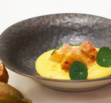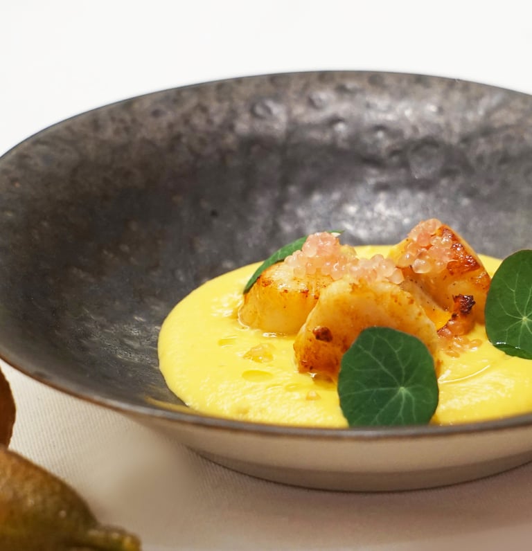 Noix de Saint Jacques rôties au beurre, citron caviar rose et velouté de potimarron