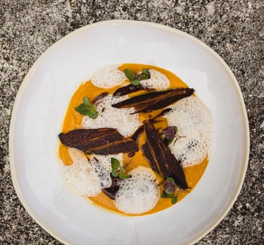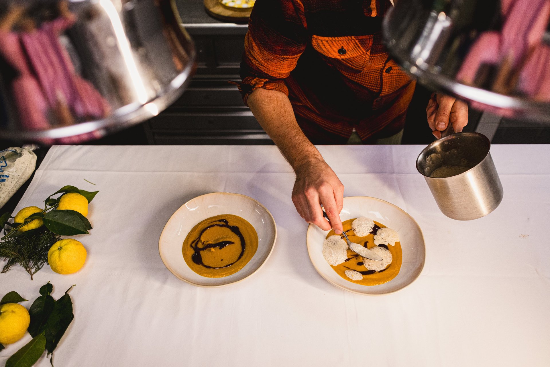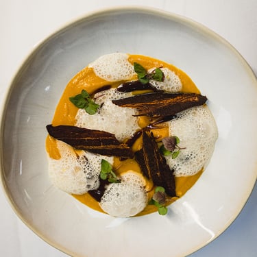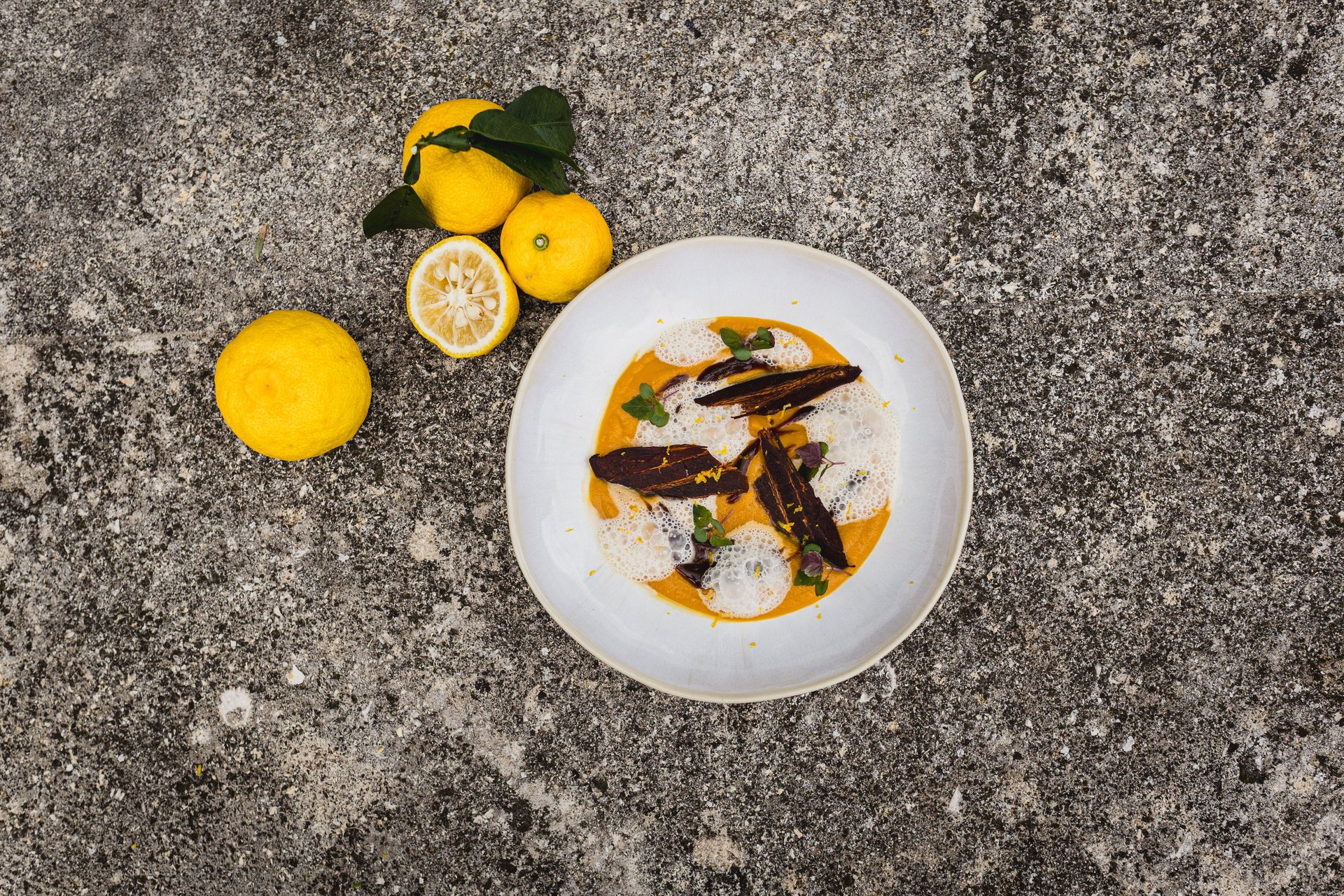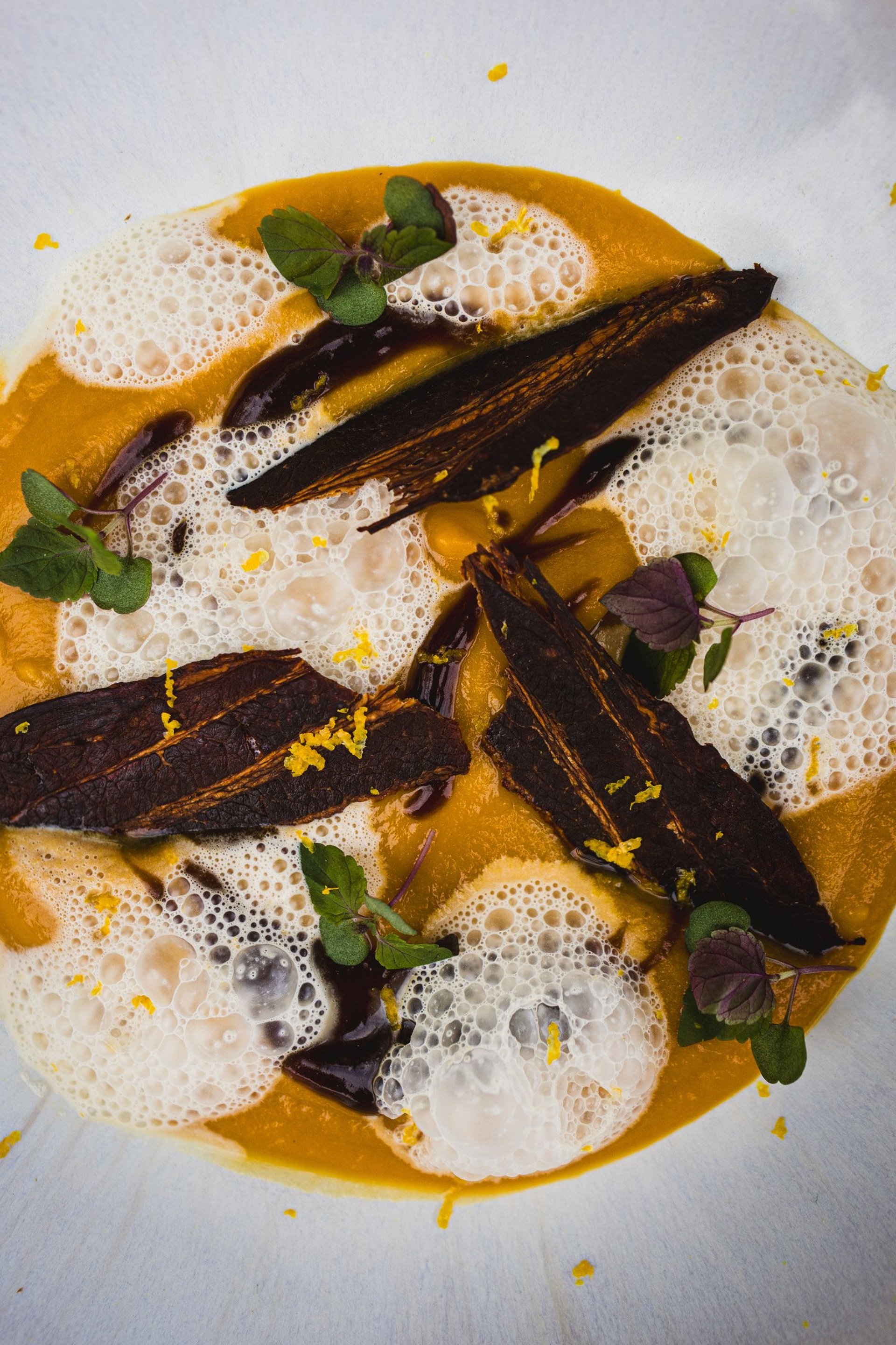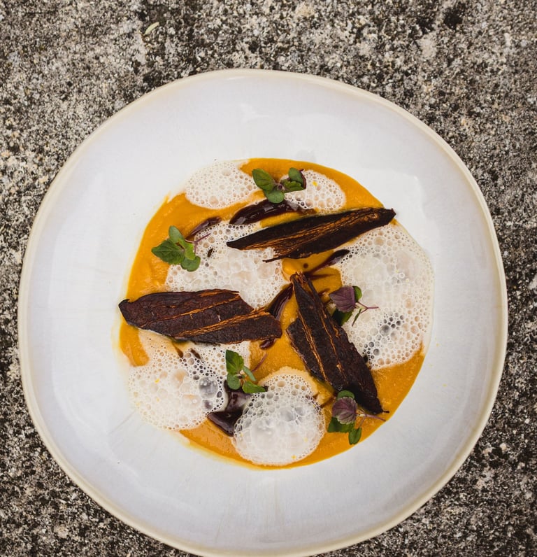 Velouté de butternut, écume de yuzu et lard fumé croustillant